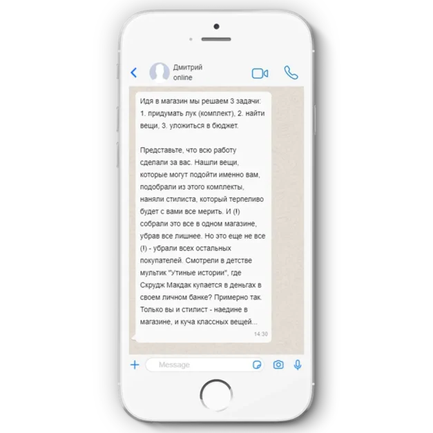 Стилист подбирает 3-5 образов на выбор. Все эти образы точно подойдут под твои особенности фигуры. Ты не потратишь время на примерку лишних образов и не разочаруешься своим отражением в зеркале